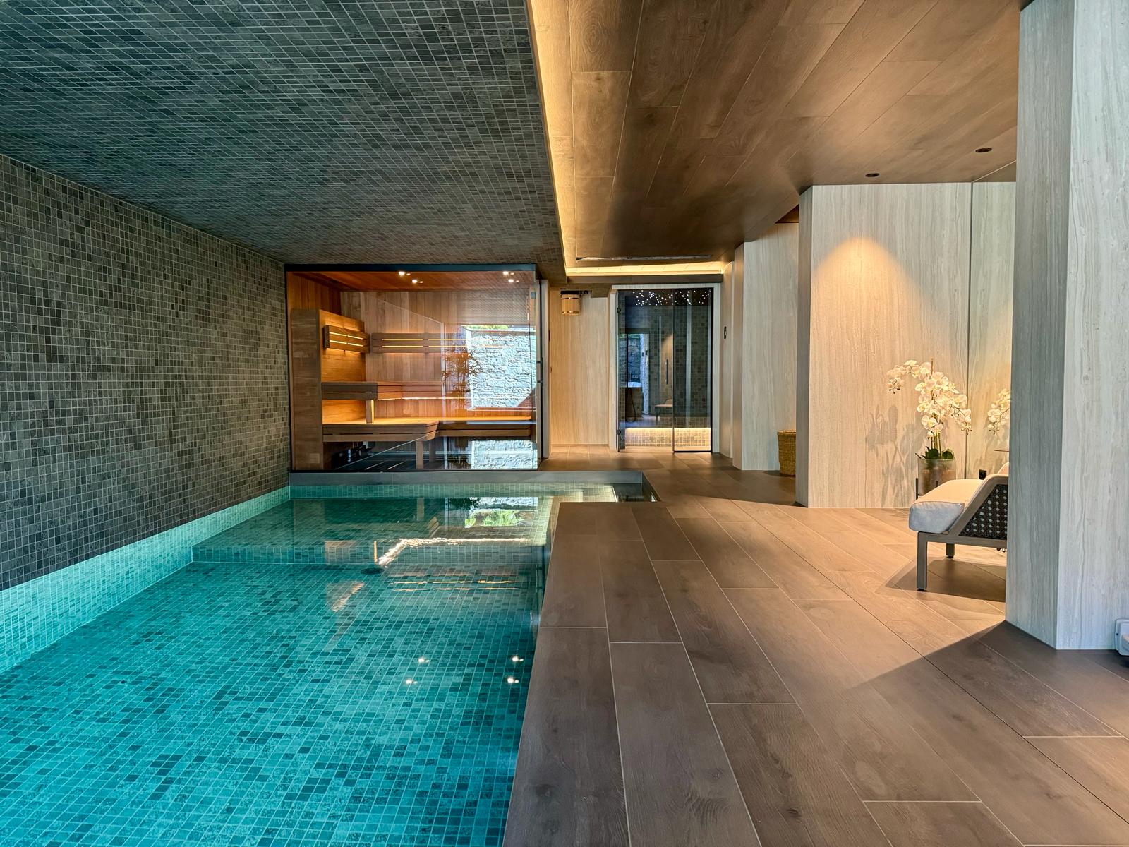 Espace bien-être conçu dans un chalet privé, avec un programme complet : piscine intérieure, bain froid, spa, hammam, douche sensorielle et sauna.