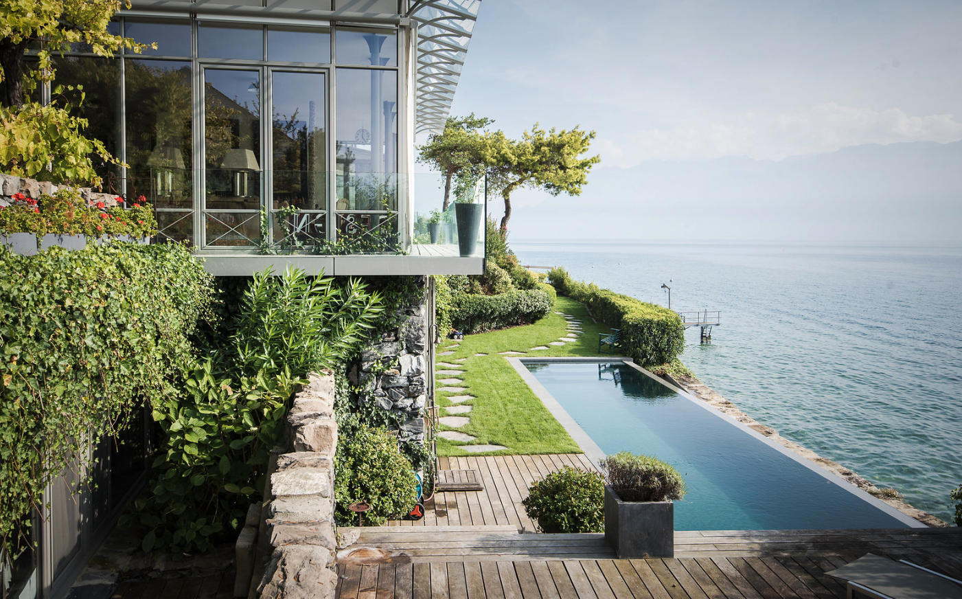 Piscine réalisée sur une propriété au bord du lac, avec un bassin d’environ 12 mètres en mosaïque et carrelage.
