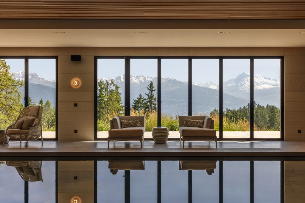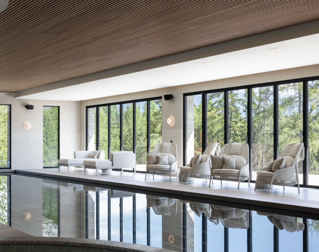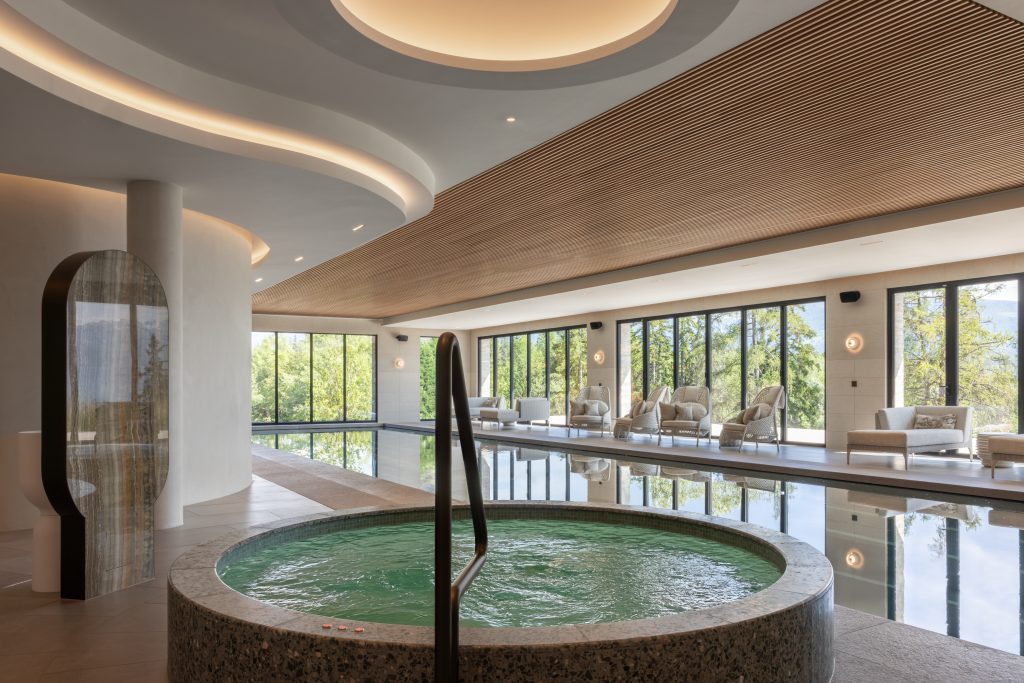 Espace bien-être conçu dans un chalet privé, avec un programme complet : piscine intérieure, bain froid, spa, hammam, douche sensorielle et sauna. L’ensemble a été pensé pour un usage intensif, une qualité d’eau stable et une maintenance maîtrisée.