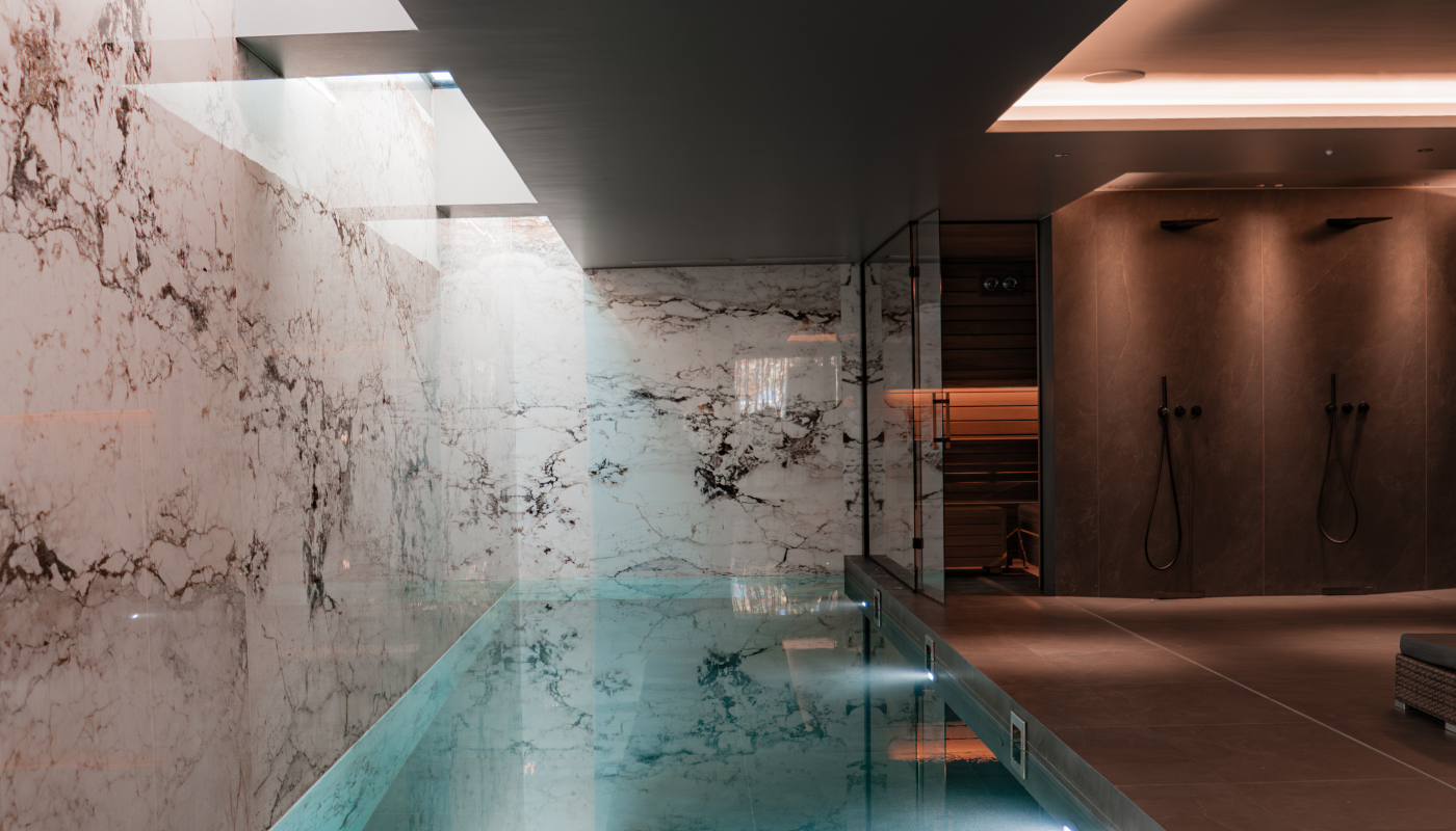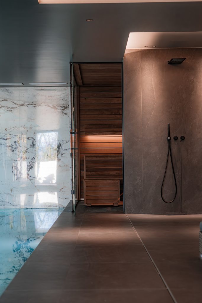 Projet familial réparti sur deux villas, avec une logique identique d’une maison à l’autre. Villa 1 : piscine extérieure à débordement 12 x 6 m, bassin intérieur 9 x 3 m, hammam, sauna et bain froid extérieur. Villa 2 : configuration en cours de construction.